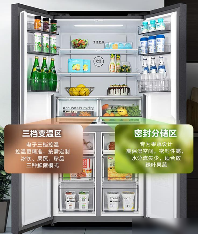 这款冰箱采用了高效能的压缩机, 保证了快速制冷和低能耗,能够有效地保持食物的新鲜度和品质,同时还具有多种智能功能,如温度调节、湿度调节等,方便用户根据需要进行设置。