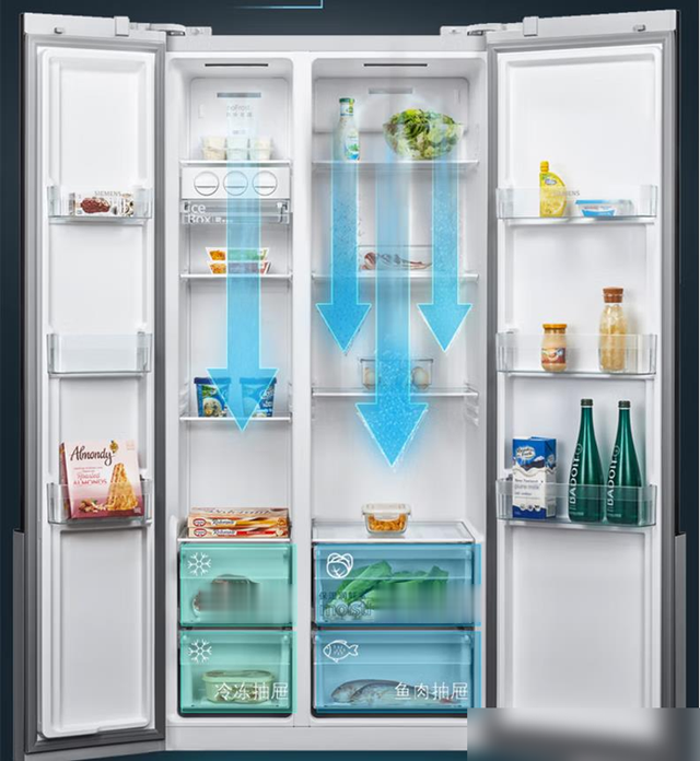 风冷冰箱采用了风扇循环空气的方式来实现控温,相较于直冷冰箱,风冷冰箱在控温均匀性、食材保鲜度和防霜方面更具优势。